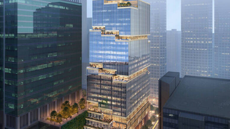 A new mixed-use office high-rise at 590 W Madison Street in West Loop Gate. Located on the northeast corner with N Jefferson Street, the tower will replace a narrow parking lot used by the existing tower at 540 Madison next door.